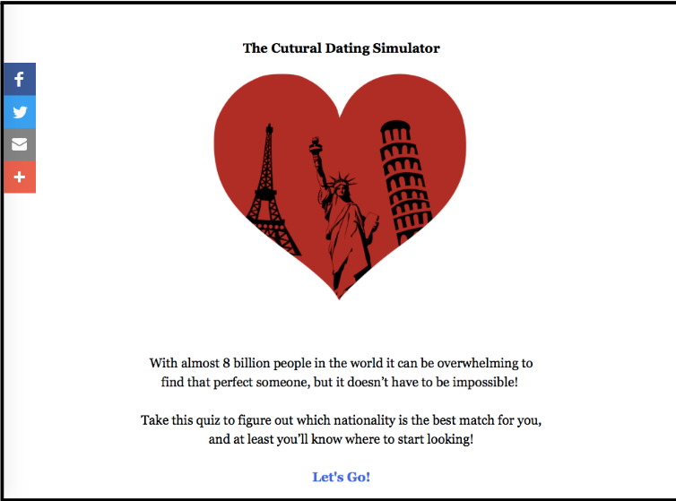 Cultural Dating Simulator: Proyecto de medios virales diseñado en Twine, un software de diseño narrativo interactivo. Es una exploración lúdica de la intersección entre el amor y la cultura, basada en el auge de las citas en línea y en la cuestión cada vez más importante de la identidad nacional.